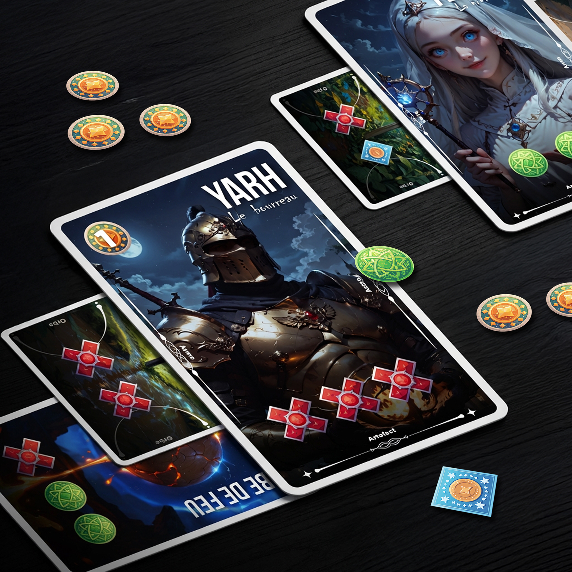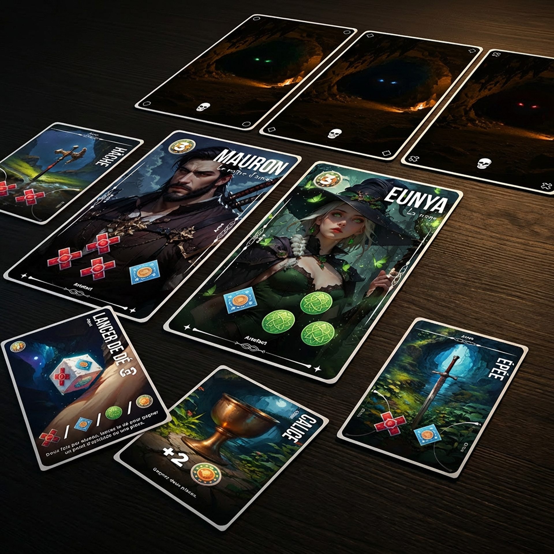 Le travail de conception a couvert l’ensemble du projet : création des règles, design ergonomique des cartes, développement de l’univers graphique, réalisation des illustrations et conception des éléments de jeu (cartes, livret de règles, packaging, jetons, pièces, dés et supports promotionnels).